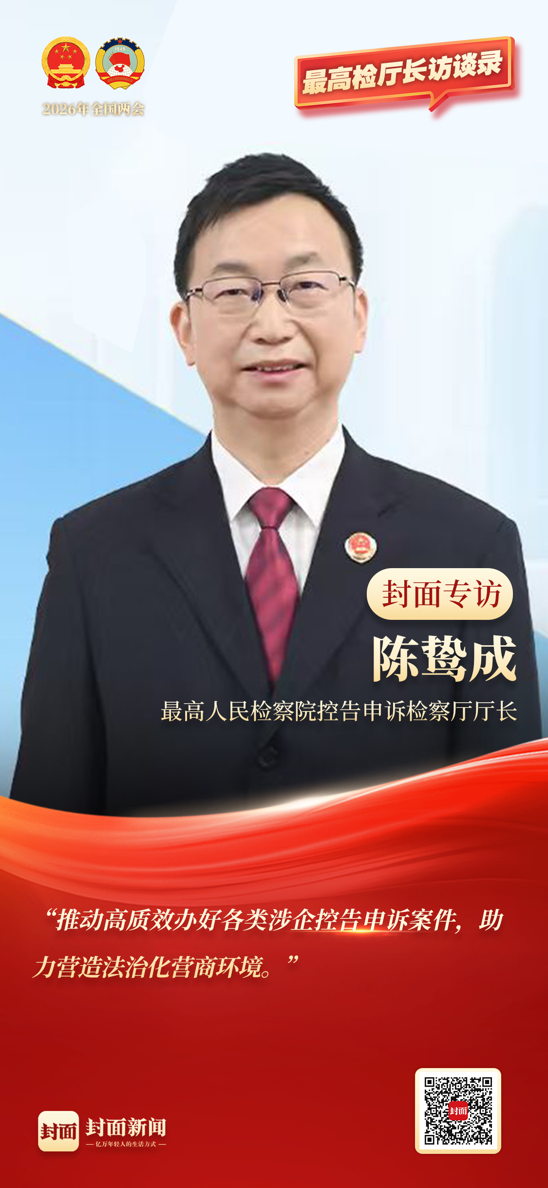 陈鸷成:全国检察机关深入贯彻落实党的二十届四中全会精神,坚持以检察信访工作法治化为牵引,聚焦高质效办案、矛盾纠纷法治化实质性化解和反向审视等控告申诉检察主责主业,积极参与社会治安综合治理中心规范化建设,着力打造新时代“枫桥经验”检察品牌矩阵,为推动矛盾纠纷源头化解、多元化解、有序化解,促进高效能社会治理贡献控告申诉检察力量。