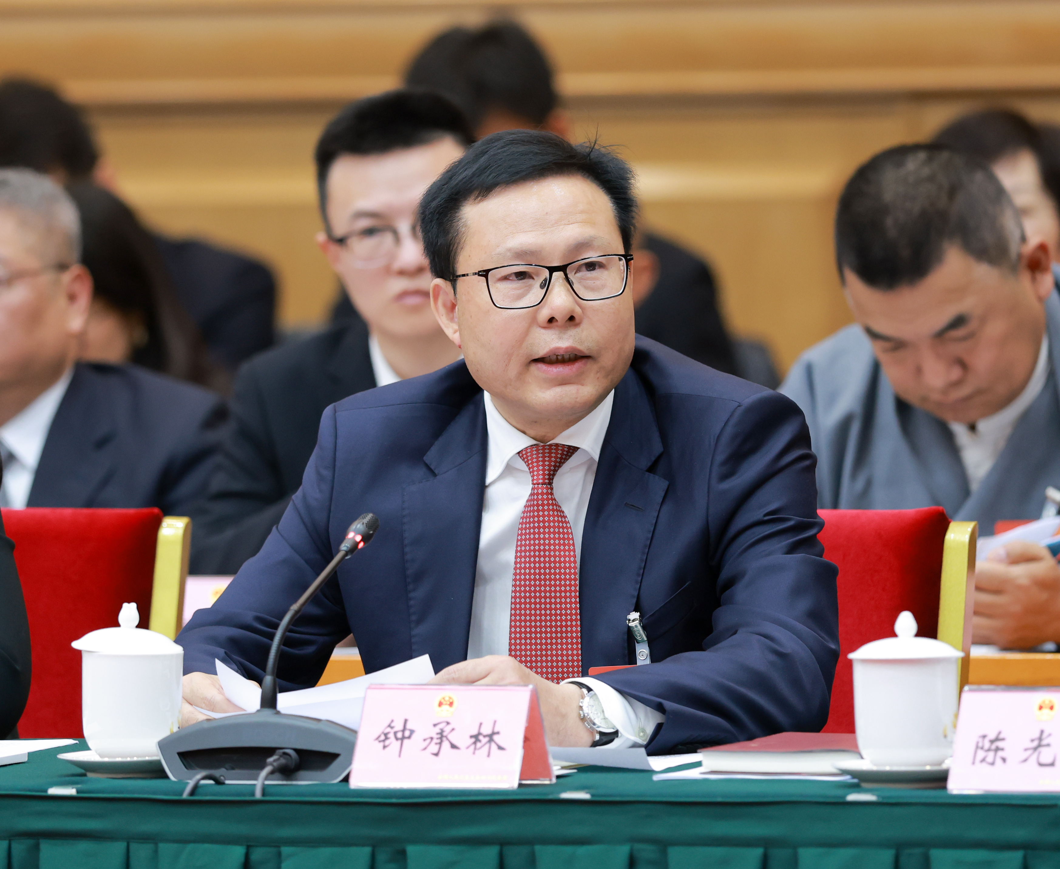 全国人大代表、四川省生态环境厅厅长钟承林在小组会议上发言(摄影 欧阳杰)
